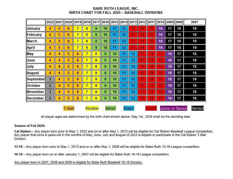 Evaluation Dates will be the following days, with check-ins being at the concession stand near the Cal-Ripken fields (4, 5, 6, 7)